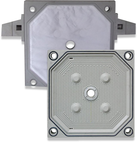 These are recess plates with groves on the bearing surface in which a gasket fits. Below the gasket grove on the bearing surface itself, there is another grove in which the cloth is fitted through a chord. The gaskets of one plate seal onto the bearing surface of another thus providing a leak proof solution. Also since the cloth is fixed onto the plate through the grove, it does not extend onto the bearing surface at the bottom thus aiding to the leakproof design as minor seepages do not occur.